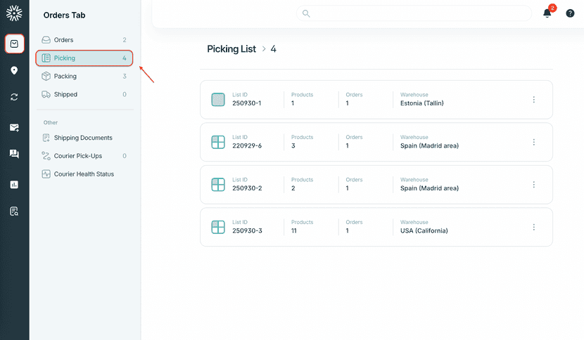 When you enable Smart Picking, all products in your selected orders are grouped into product lists, allowing you to collect everything in a single pass through the warehouse.