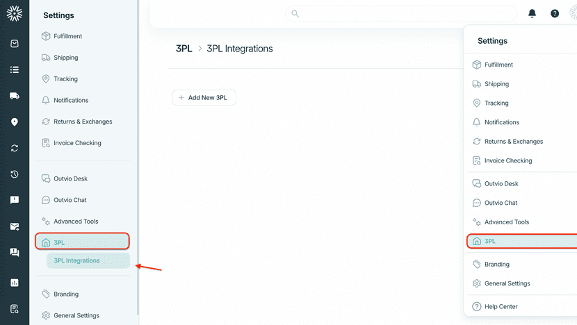 Click on Settings in the top right corner and choose 3PL Integrations from the menu.