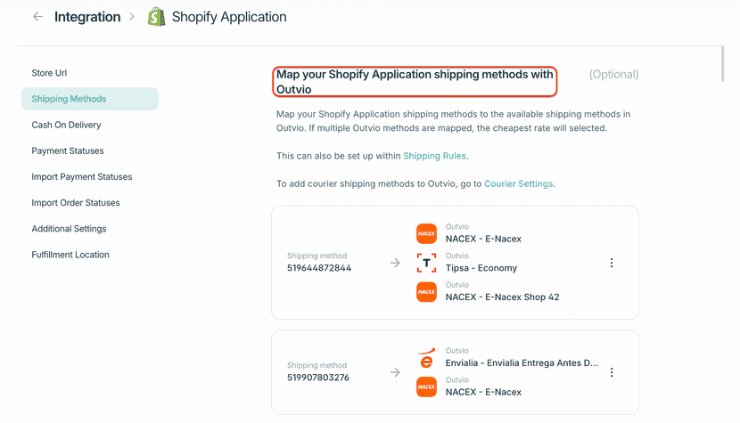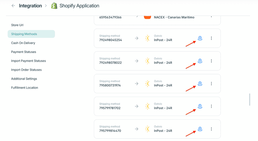 To display the pick-up points with Shopify, go to Outvio > Settings > Integrations > Shopify and go to Step 2 (Map your Shopify Application Shipping Methods to the Shipping methods available in your Outvio account).