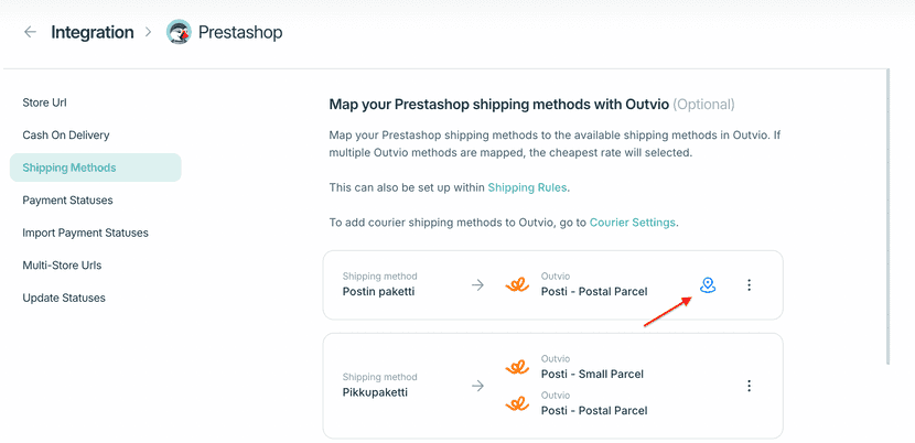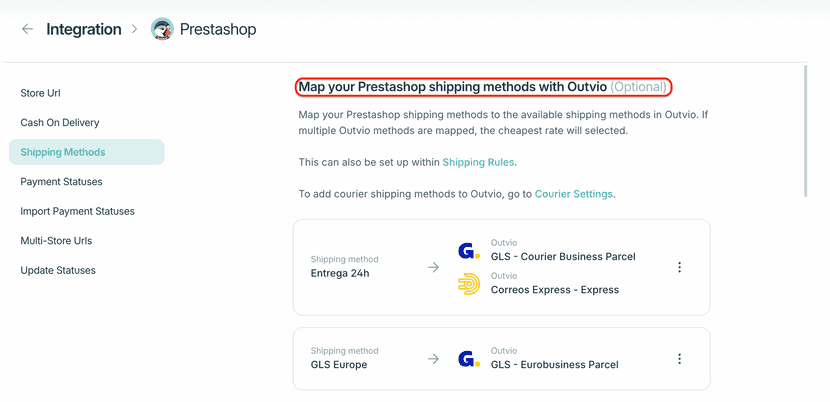With both Prestashop and WooCommerce integration, navigate to Step 3 Shipping Methods - Map your Prestashop/WooCommerce Shipping Methods to Shipping Methods available in your Outvio account.